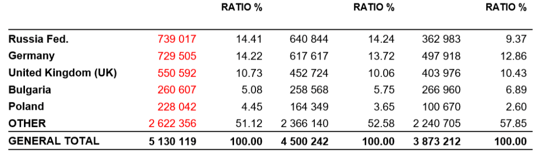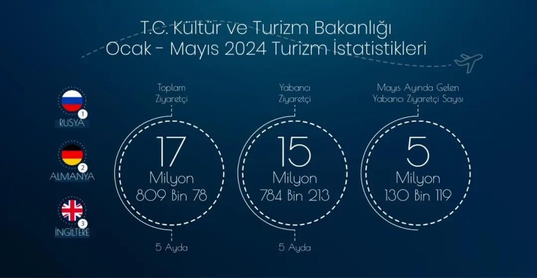 在2024年5月,土耳其的前五大游客来源地分别是俄罗斯(739,017人)、德国(729,505 人)、英国(550,592 人)、保加利亚(260,607人)和波兰(228,042人)。